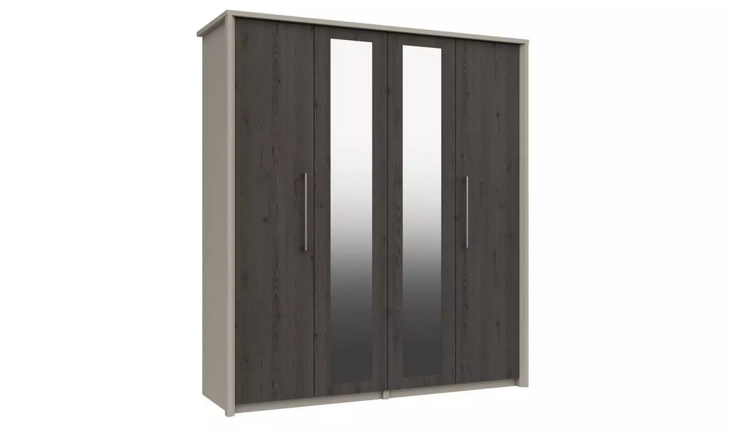 Fall for the charms of our Lancaster collection. This 4-door mirrored wardrobe boasts natural-looking textured grain fronts, with a contrasting carcass. Its dark tone will bring richness and warmth to your space. The mirrored front helps reflect light for a brighter bedroom. We've given the Lancaster a wonderful finishing touch with its slim D handles in brushed nickel and pewter. After all, your clothes deserve to be stored in something beautiful!