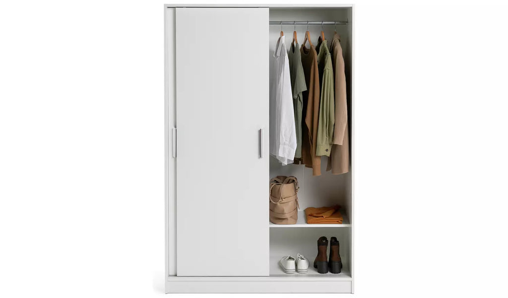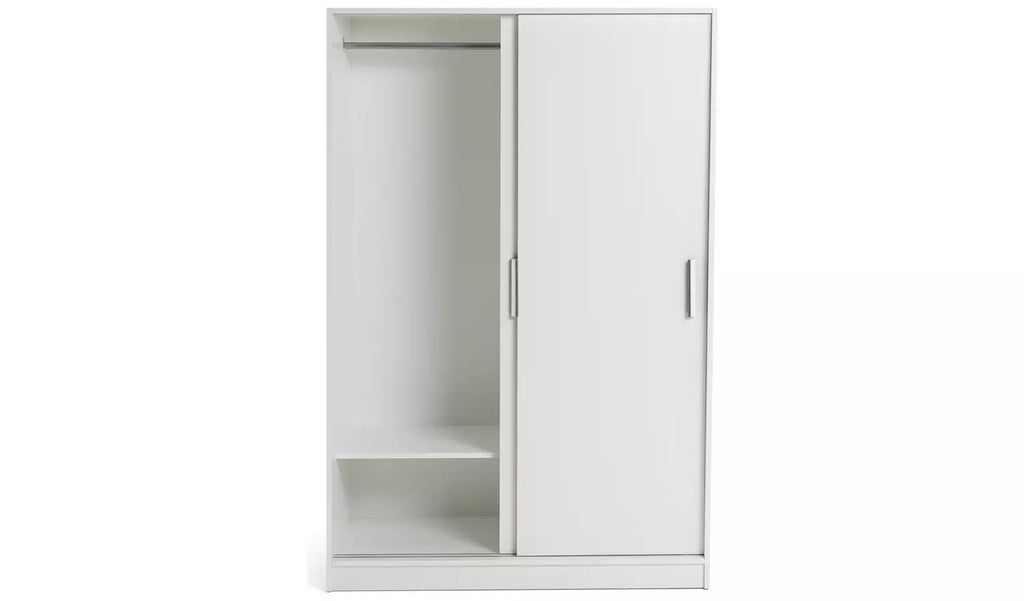 Keep your wardrobe stylish and organised with the Nova 2-Door Sliding Wardrobe. Designed to save space without compromising on storage, this wardrobe features two spacious hanging sections separated by a central divider, plus two fixed bottom shelves with additional understore cubbies — perfect for shoes, bags, or folded clothing. Its smooth sliding doors make accessing your fashion collection effortless.
